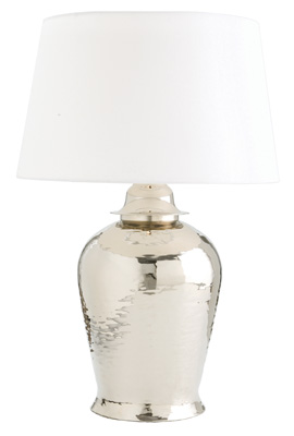 A traditional ginger jar reinterpreted in hammered polished nickel, making something old new again. The linen shade with top diffuser reinforces its new modern feel. 3-way switch.