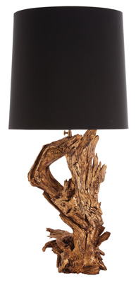 The rich hand applied gold finish on the rough shape and surface of the tree root creates the perfect yin and yang. The simple black fabric shade, adjustable neck and one-of-a-kind status only add to its distinction. 3-way switch.