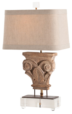 This traditionally styled capitol rests on brass supports and is finished with white wash and gold accents. The lamp is topped with a natural linen shade with smoke gray cotton lining with 1″ trim.