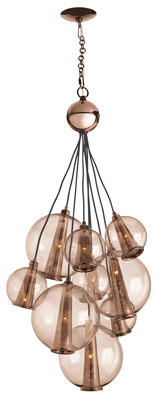 This rose gold nine light cluster of 6″ and 10″ rose colored clear glass spheres can be adjusted (48″ – 84″) by adding more chain.