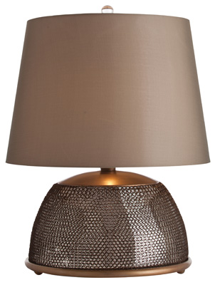 This Laura Kirar designed table lamp in distressed mercury glass and antique brass chainmail is shown with a shade made in a sheer taupe material, lined in silver metallic fabric with a top diffuser.
