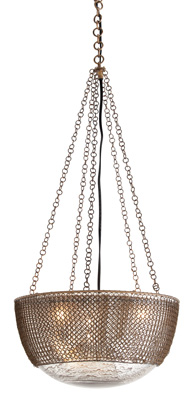 This three light design by Laura Kirar is made of distressed mercury glass which has been dressed in antique brass chainmail and hung from five antique brass chains.