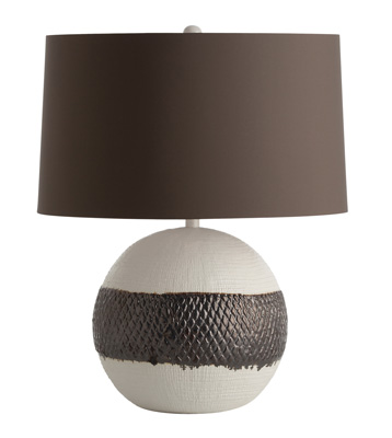 This textured matte white sphere is banded in a contrasting rich bronze reactive glaze. The wren microfiber sade lined in white cotton matches the center band giving it a visually balanced feel.