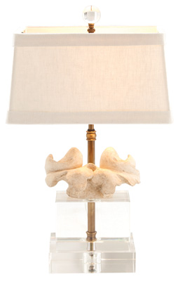 A hand carved remnant sits atop an oversized acrylic base. The lamp is topped with an off-white linen shade with cream cotton lining.