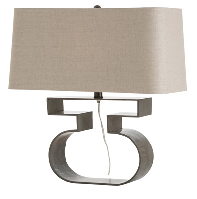 Hand formed on a jig, this iron lamp resembles the outline of a stylized rotary telephone. It is French wired (cord exits from socket). The rectangular shade has rounded corners It is made in a textured linen lined in light grey cotton.