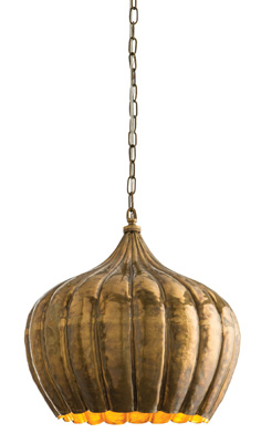 The vintage brass one light pendant features a fluted gourd shape with hand hammered surface detailing for added luster. Coordinating lamp available (46744-495). Additional chain (CHN-976).