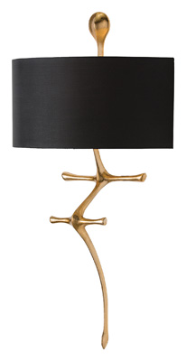 This organic brass sconce finished in gold leaf speaks to movement as it arches from the wall. Looks best when placed so you can take advantage of its profile and the dramatic shadow it casts on the wall. Perfect for hallways.
