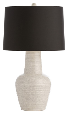 This porcelain lamp features a white crackle glaze that has been stained with black ink so it emphasizes the crackle pattern. The irregular horizontal surface ribbing is a result of each being hand thrown on a wheel.