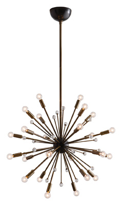 Inspired by a trip to Paris, this 24 light modern starburst design in vintage brass is the perfect choice if you want drama, lots of light and a mid-century look. Also available in a larger size (89979). Shown with small clear globe bulbs.