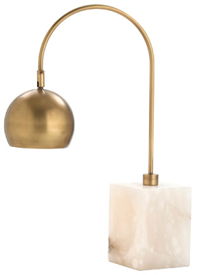 Adjustable modern desk lamp with a square snow marble base and arched arm with sphere-like shade finished in vintage brass.
