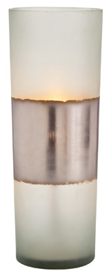Frosted translucent glass cylinder banded with hand applied silver leaf becomes a shimmering, glowing source of light on any shelf or table top.