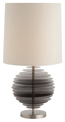 Fifteen brushed steel metal discs stacked on an antique brass center pipe. The tall drum shade is made from ivory micro-fiber and lined with cotton.