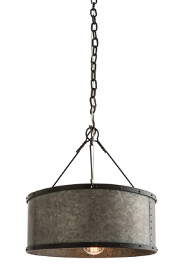 Galvanized one light pendant with an iron band and nail head detailing at the top and bottom. Its smaller size makes it perfect for a powder room or hallway. Shown with Nostalgic thread bulb. Additional chain available (CHN-992).
