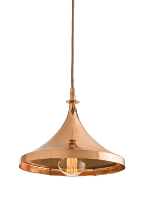 This one light, copper pendant with taupe fabric cord introduces an old, yet now new, finish. We believe in mixed metals, so use in rooms with polished nickel or brass hardware. Shown with a Nostalgic thread bulb.