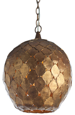 Handcrafted pendant with rustic diamond shaped antique gold finish leaves are pieced together to form a dome. Additional chain available CHN-973.