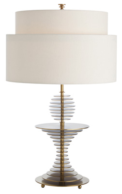 Antique brass discs of varying sizes are creatively stacked to create this unique shape. The 2 tier linen shade lined in cotton mimics the base.