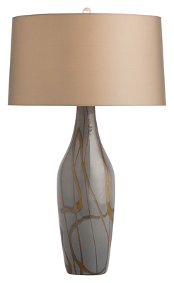 The simple bottle shaped glass base is a swirl of grays and caramel. Each mouth blown piece creates a unique pattern…so no two will be the same.