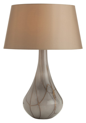 Teardrop shaped smoke colored glass table lamp with a caramel drizzle accent. Topped with a taupe sheer drum shade with light gray sheer lining.