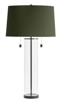 Double socket clear glass cylinder table lamp with iron base and is topped with flared wren brown shade with metallic silver sheer lining. Accented with a pair of antique brass pull chains and matching finial. 3-way switch.