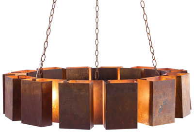Ring shaped 14-light iron pendant light creates a glowing luminaire effect with each light in open rust finished box.