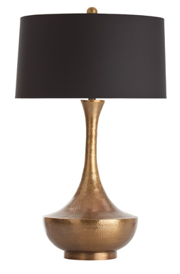 Handcrafted brass table lamp in a tapered vase shape features hammered, antiqued finish with a matching finial. Topped with a black shade with white cotton lining. 3-way switch.