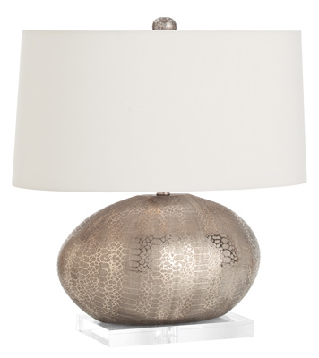 The Winslow Lamp features an egg shaped oval porcelain table lamp with snakeskin texture in metallic silver finish and mounted on clear acrylic base. Topped with an oval pewter shade with white cotton lining and matching finial. 3-way switch.